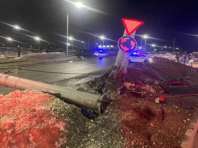 После столкновения иномарка выехала на полосу, разделяющую встречные потоки, и наехала на опору линии электропередач.
