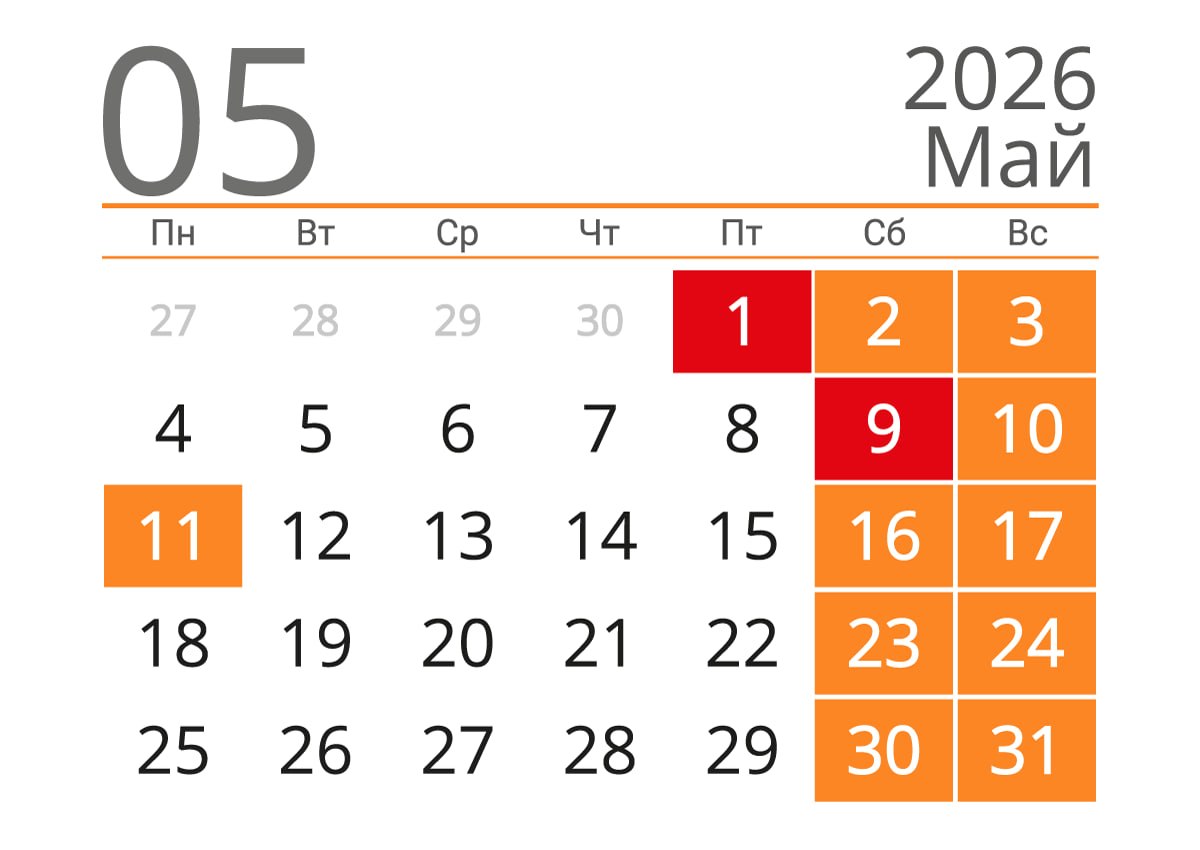 Следующий блок выходных, приуроченный ко Дню Победы — с 9 по 11 мая (с субботы по понедельник).