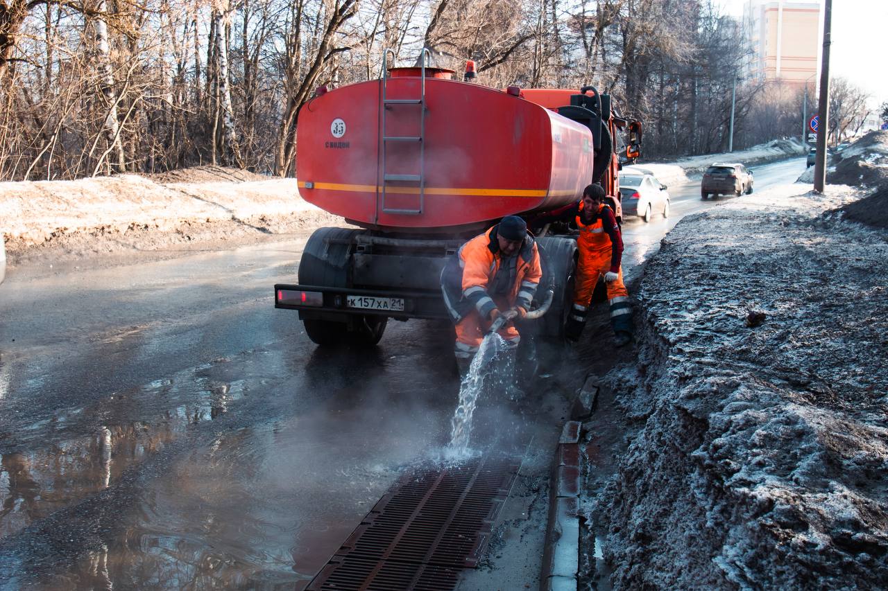 Специалисты повторно проверяли колодцы, при необходимости пробивали лёд, расчищали решётки, забитые снегом и льдом, чтобы талая вода уходила в систему, а не скапливалась на дорогах.