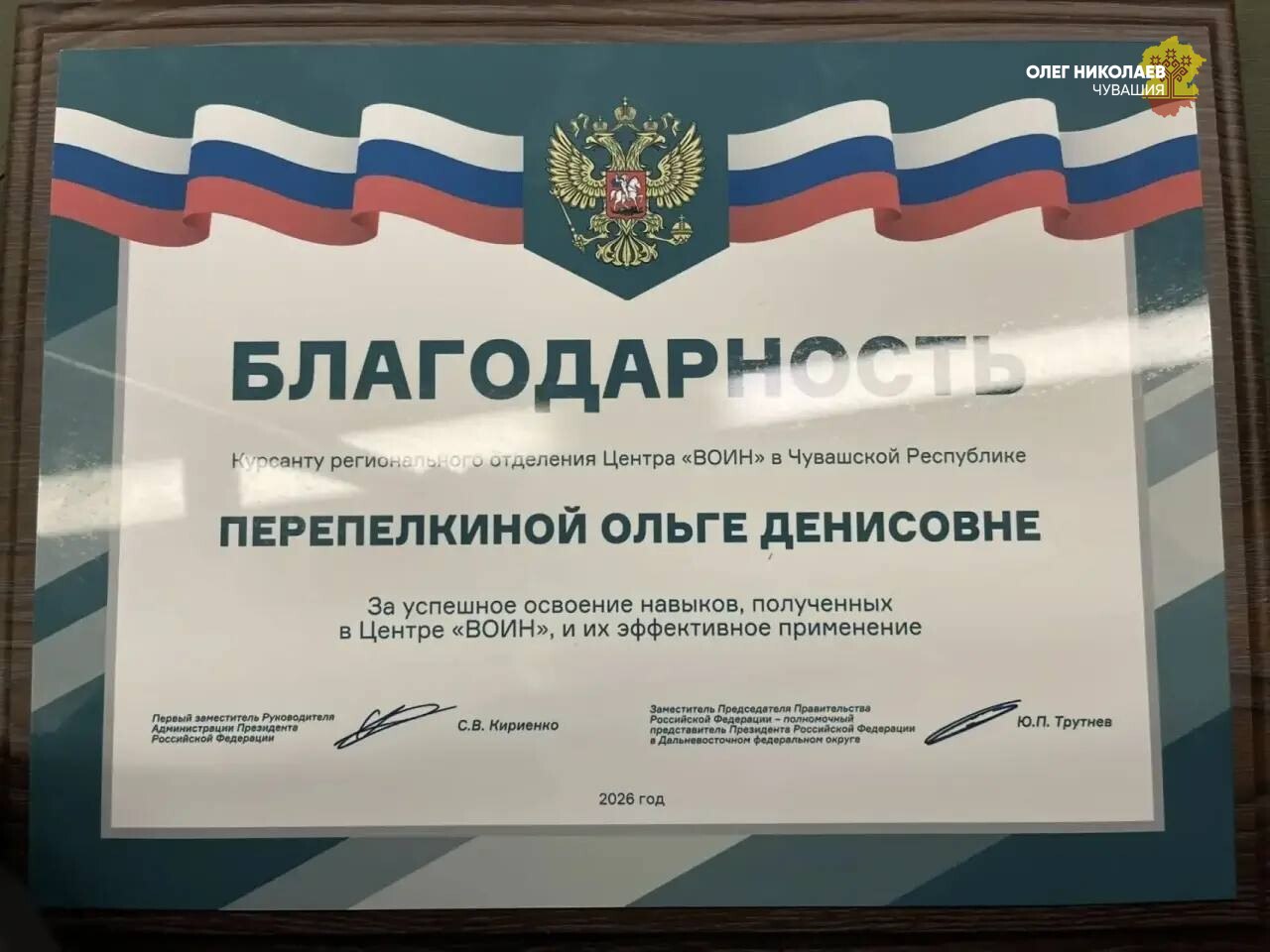 Особо хочу отметить наших лидеров. Благодарность Центра вручена Игорю Семенову за развитие направления беспилотных систем. Отмечена благодарностью за успешное освоение навыков и их эффективное применение курсант-гвардеец Ольга Перепелкина.