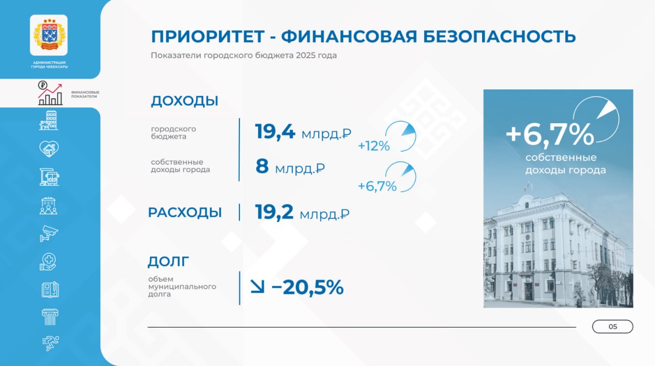 Доходы бюджета за 2025 год выросли на 12% и достигли 19,4 млрд рублей, при этом собственные доходы составили 8 млрд рублей. Расходная часть зафиксирована на уровне более 19,2 млрд рублей.