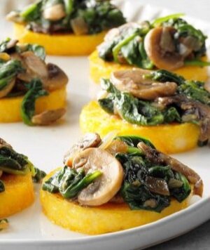 Для грибного блюда, просто нарежьте шампиньоны и обжарьте с луком. Шпинат следует пропарить до мягкости, затем смешать с грибами и выложить на резаную поленту. Это — завтрак мечты!