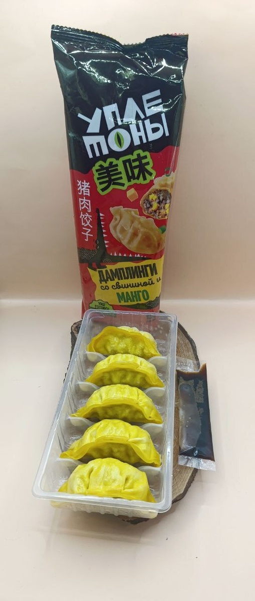Первое на что стоит обратить внимание – это дамплинги. Они представляют собой азиатские пельмени с разнообразными начинками, которые можно как варить, так и обжаривать. В упаковке весом 150 грамм, стоящей всего 150 рублей, находятся пять пельменей со свининой и манго. Данный дуэт вызывает интерес, и хоть манго не всегда чувствуется, в обжаренном виде они оказываются сытными и вкусными. Соевый соус добавляет пикантности, делая блюдо более гармоничным.