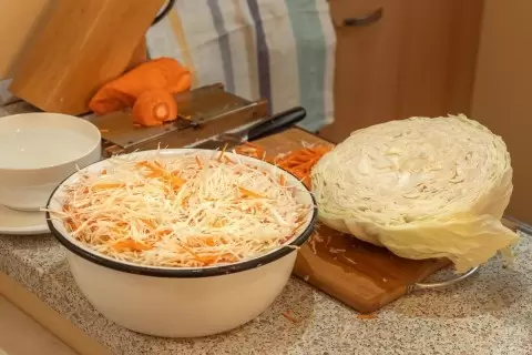 Следуйте пошаговой инструкции: нашинкуйте капусту тонкими полосками и натрите морковь на крупной терке. Смешайте их с солью и специями, не перетирая, а просто перемешивая. Утрамбуйте смесь в банку так, чтобы сок покрыл капусту. Оставьте при комнатной температуре на 3-5 дней, ежедневно протыкая до дна, чтобы выпустить газы. Как только пена осядет и рассол станет прозрачным, уберите капусту в холодильник.