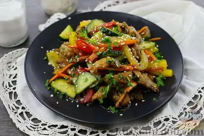 Кулинарные эксперименты продолжаются с салатом с курицей и овощами под азиатским соусом. Мясо, маринованное в соевом соусе, вместе с овощами образует гармоничное сочетание, которое никого не оставит равнодушным.