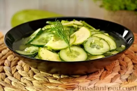 - Кабачково-огуречный салат: Хрустящий и освежающий! Нежные кабачки и свежие огурцы создают гармоничное сочетание. Заправленный уксусом и маслом, салат с яркими нотками чеснока и укропа станет идеальным дополнением к любому блюду.