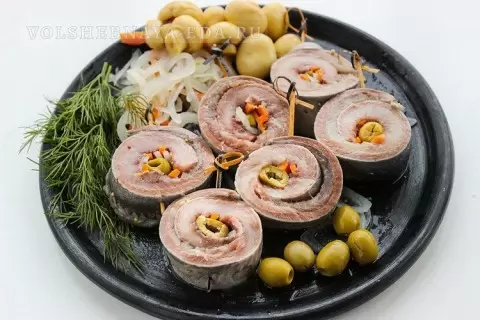 - На свободной части филе расположить полоски овощей и оливки, затем свернуть в рулетик. Закрепить шпажками.