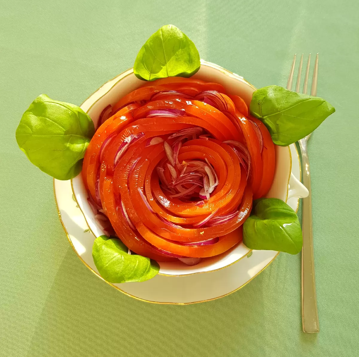 Салат «Осенняя роза» — это не просто блюдо, а настоящий шедевр кулинарного искусства, который украсит любой стол в осенний сезон. Сочетая в себе аромат свежих помидоров, сладкого лука и пышных листьев базилика, это блюдо не только порадует глаз, но и приятно удивит вкусом.