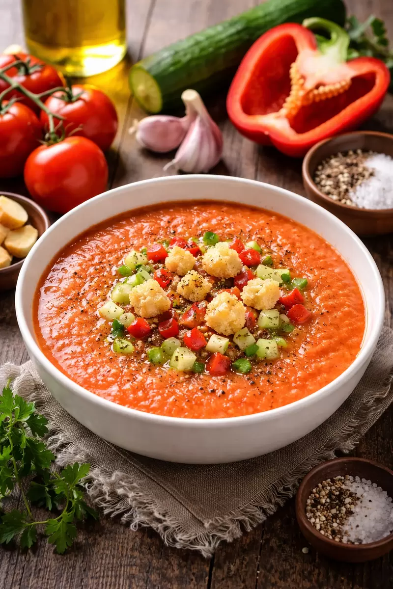 Гаспачо возник на юге Испании, в солнечной Андалусии. В условиях беспощадной жары местным жителям требовалась легкая, но сытная еда. Первые варианты этого супа готовили на основе хлеба, чеснока, оливкового масла и винного уксуса. Ингредиенты тщательно растирали в ступке, добавляя холодную воду для создания густой и освежающей массы. Помидоры, которые позже стали главной составляющей, появились в рецепте значительно позже, когда их начали активно культивировать в регионе. Когда красные плоды начали вставать в центр рецепта, гаспачо приобрел свой характерный цвет и популярность по всему миру.
