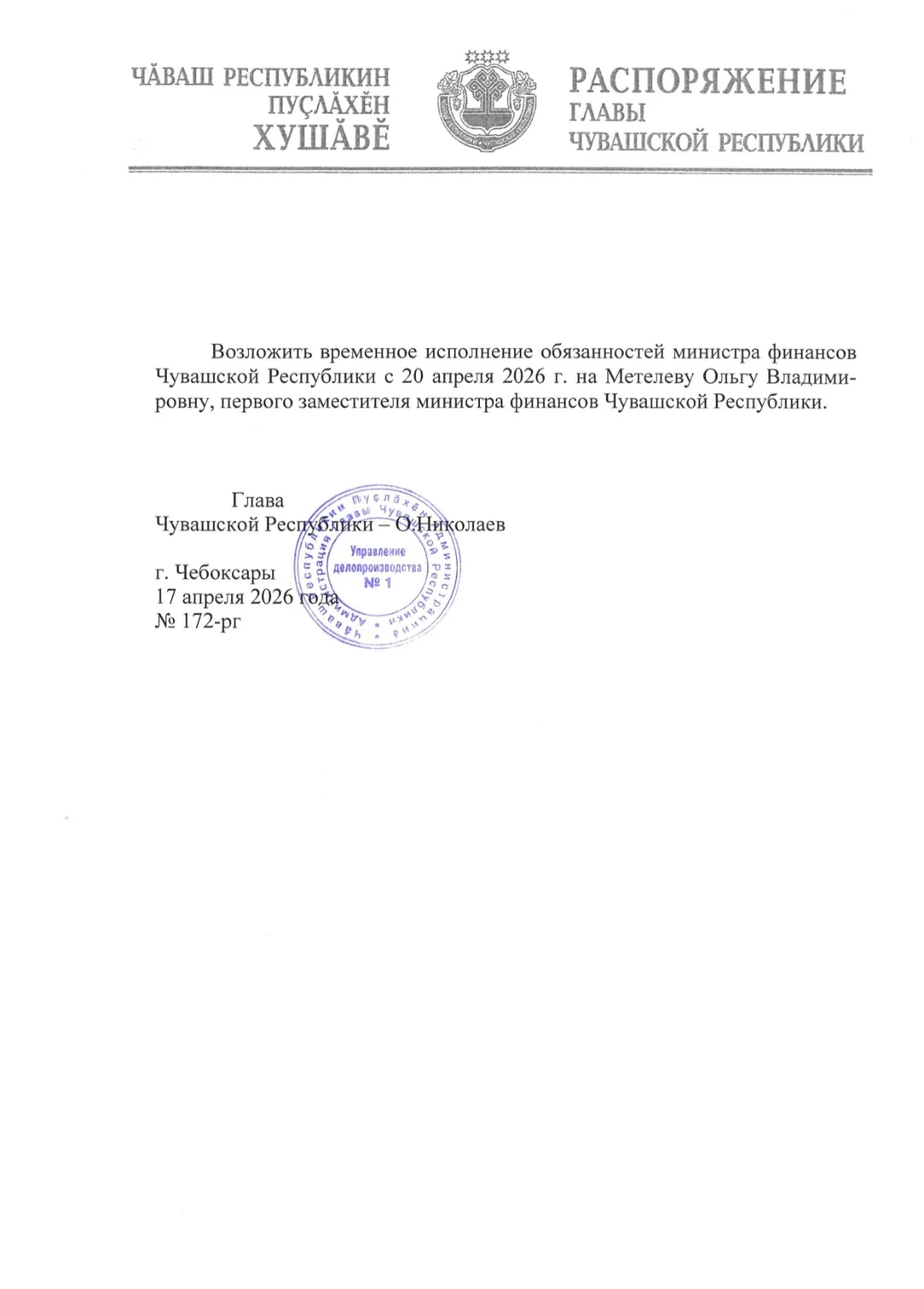 Временно исполнять обязанности министра финансов Чувашии будет Метелева Ольга Владимировна.