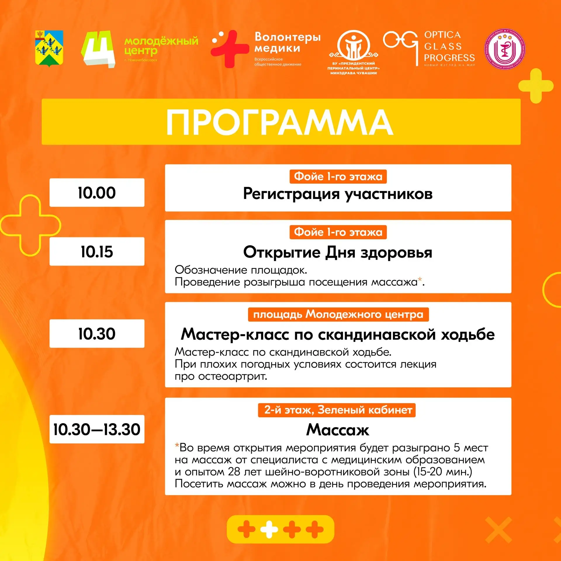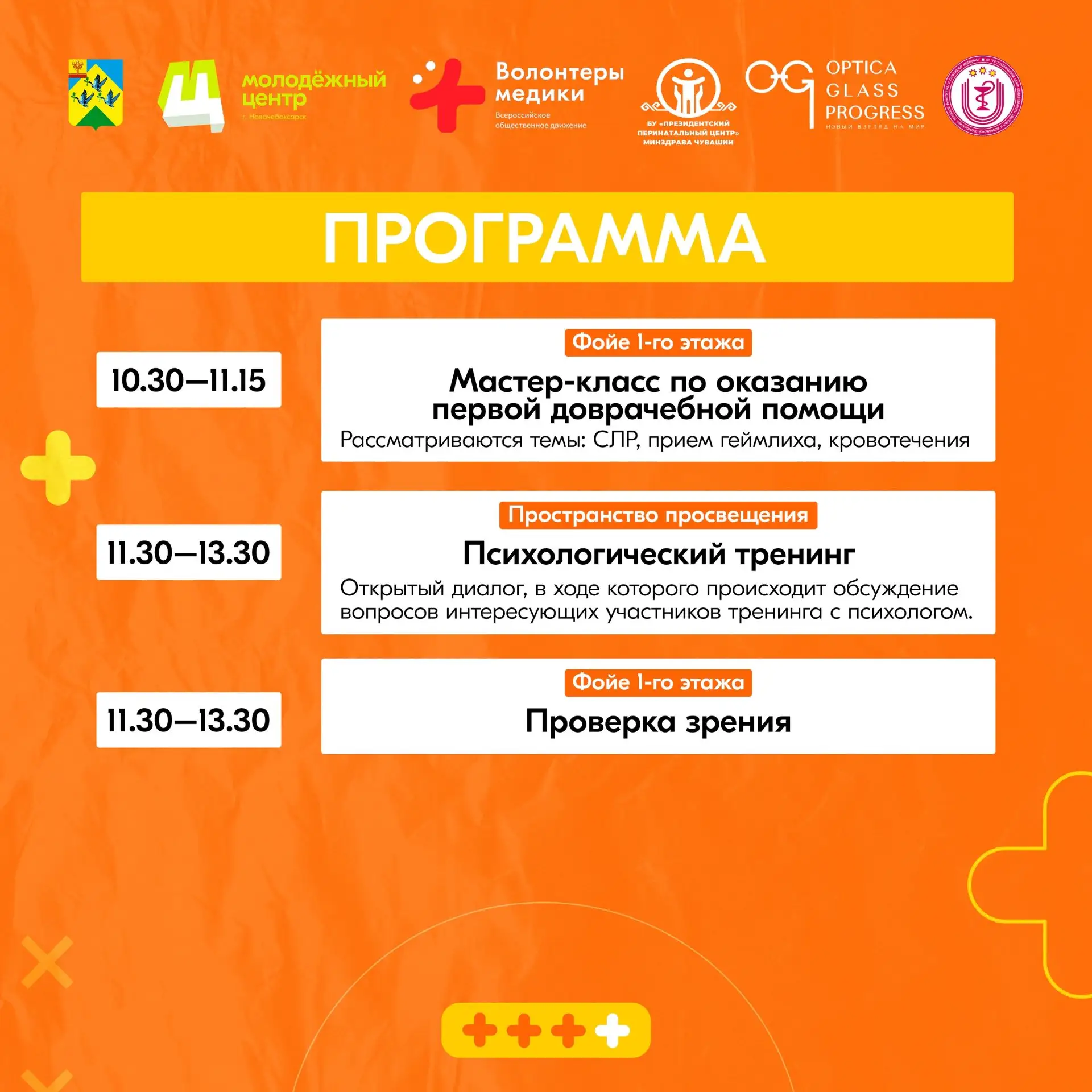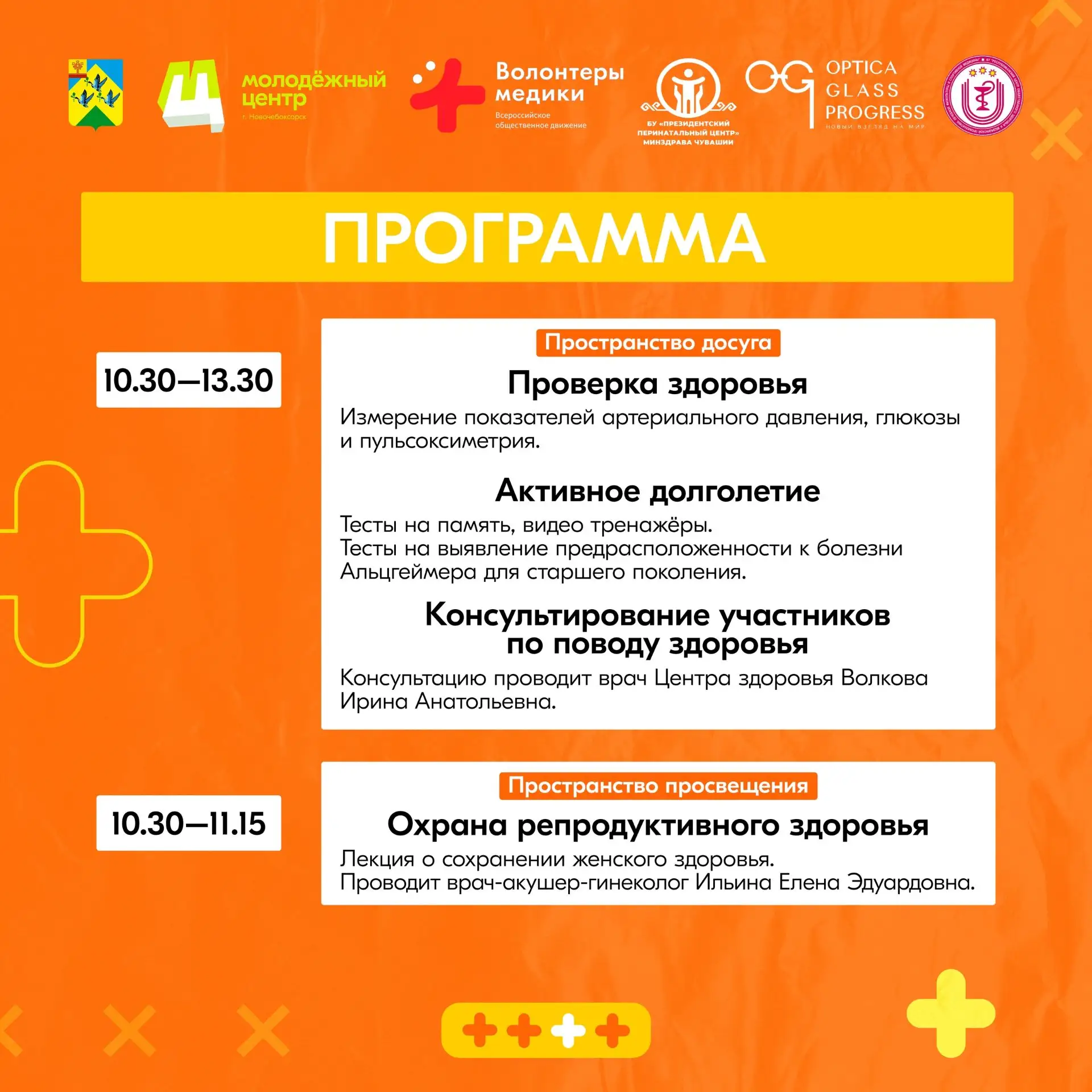 Вы сможете проверить давление, сахар и пульс, узнать как сохранить женское здоровье, научиться приёму Геймлиха на мастер-классе от волонтёров-медиков. А для тех, кто устал от рабочих будней — психологический тренинг. И всё это бесплатно.