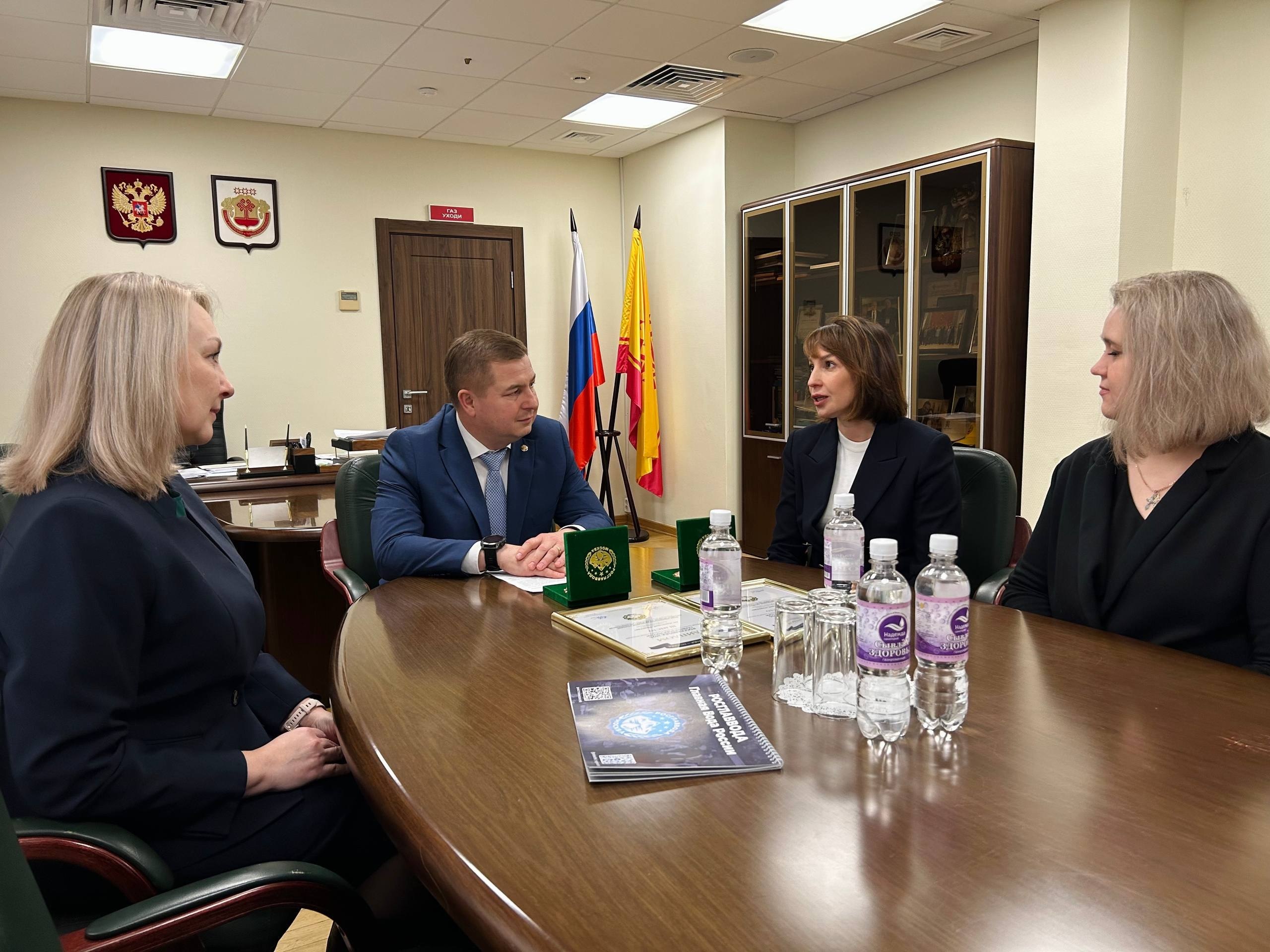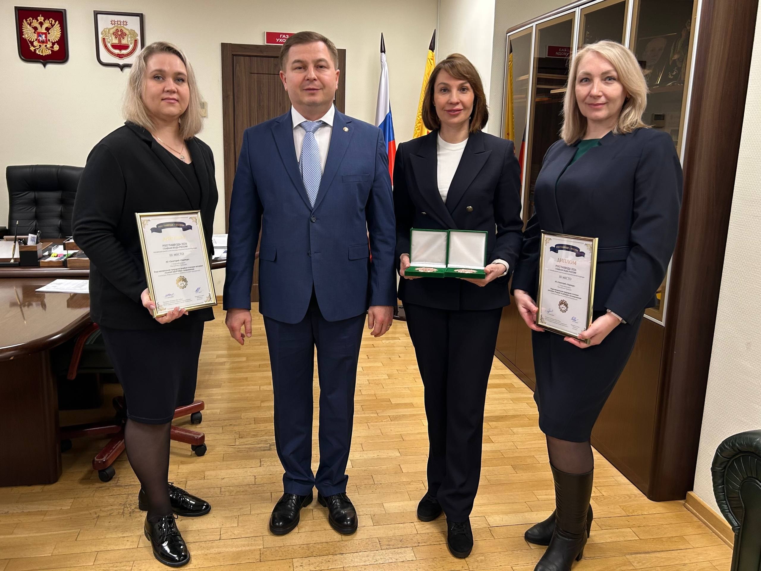 Вице-премьер Правительства Чувашии Владимир Степанов встретился с руководителем Татьяной Бикчантаевой и командой санатория «Надежда», которая представляла республику на ежегодном конкурсе качества воды и безалкогольной продукции «РОСГЛАВВОДА — Главная Вода России».