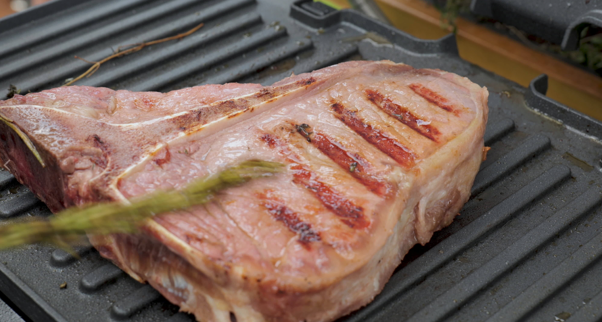 2. Создание корочки: добавьте немного масла на решетку и выложите мясо под углом 45°. Поверните его через 1-2 минуты, чтобы получить красивый узор от решетки.